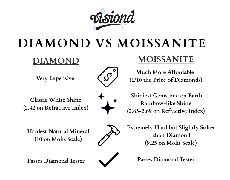Moissanite not only shines brighter than diamonds, but costs 1/10th the price, Balancing affordability with luxury.